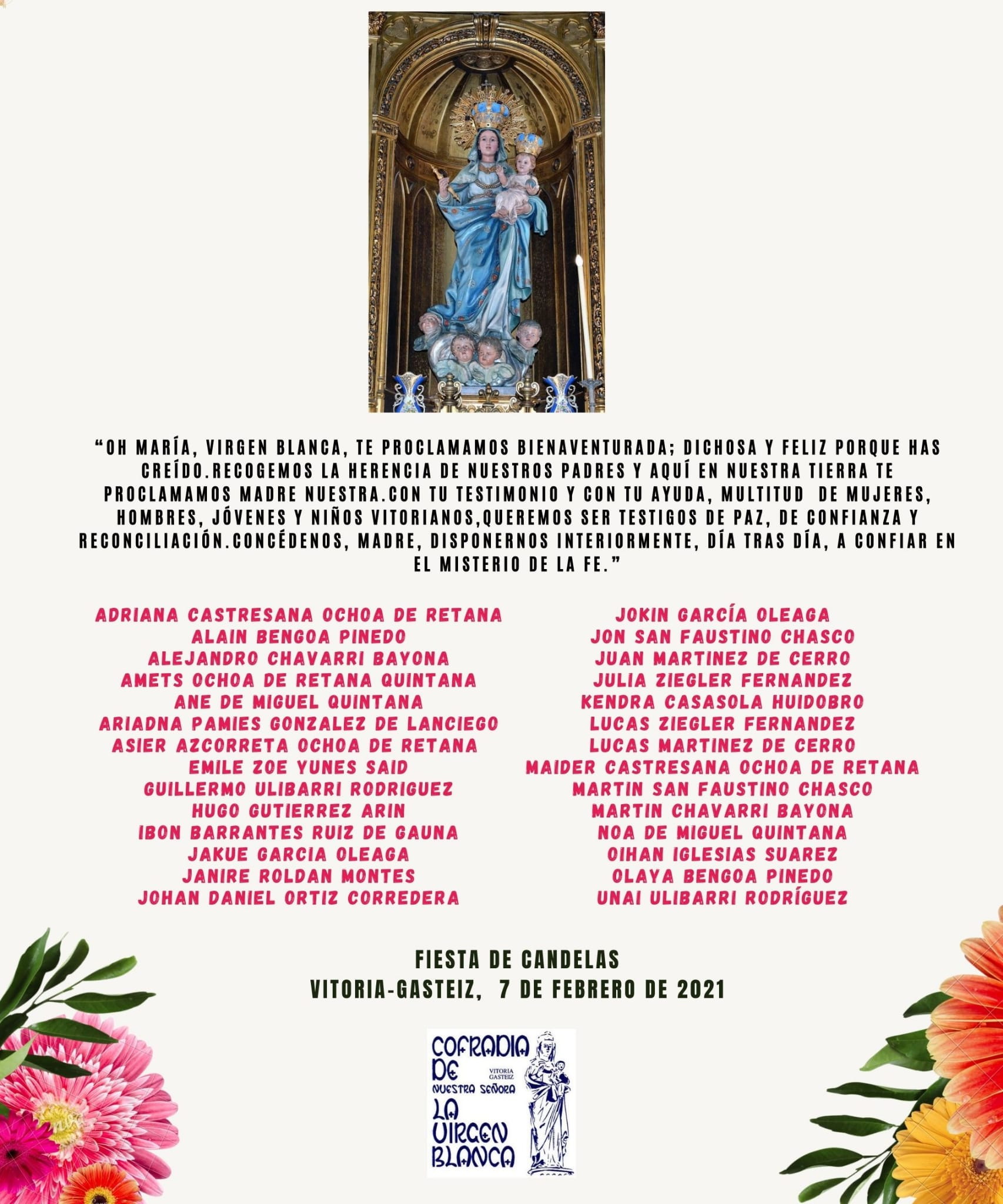 LA COFRADÍA DE LA VIRGEN BLANCA DA LA BIENVENIDA A ESTOS PEQUEÑOS Y SUPLICA A LA PATRONA DE VITORIA-GASTEIZ QUE LOS PROTEJA.