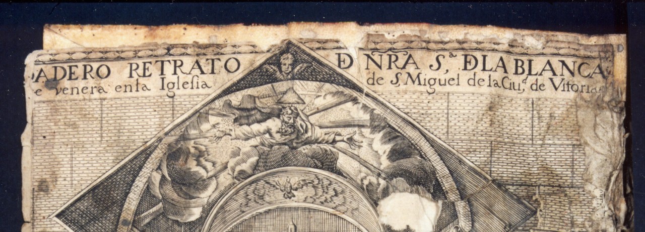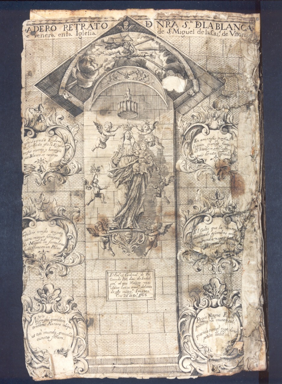 Del facsímil donado debemos destacar que la Virgen se halla rodeada de seis ángeles y colocada sobre una ménsula adornada con cabeza de querubín. Sobre ella, un elemento a modo de “turris eburnea”, que cobija la imagen que está adosada a un muro liso, sin la forma semicircular o nicho, tal y como aparece en el grabado de Fossman. El encabezamiento del grabado de Zaitorda es el siguiente: Verdadero retrato de Ntra. Sra. de la Blanca que se venera en la Iglesia de San Miguel de la ciudad de Vitoria.