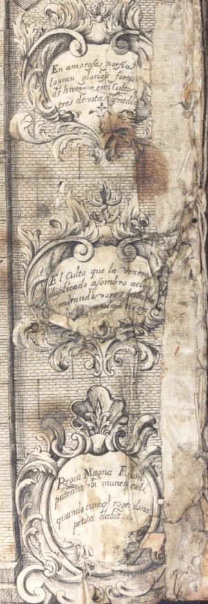 | «En esta sagrada esphera transformada está la Esposa pues fue morena y hermosa y por Blanca se venera.» | «En amorosas porfías logran gloriosa fortuna de hacerse en el culto tres devotas Cofradías |