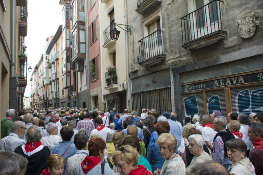 Todos los participantes en la escalinata de la subida a la Parroquia de San Miguel , Santuario de la Virgen Blanca cantan la AURORA 2019 , el “Himno a la Virgen Blanca” y “Ave María” de R, Loza y J. Moraza, anunciando a la Ciudad que ya se acercan las Fiestas en Honor a nuestra patrona la Virgen Blanca.