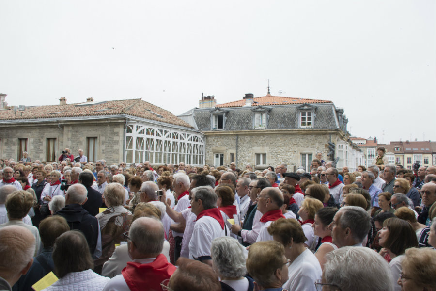 Todos los participantes en el Pórtico de la Catedral de Santa María cantan la “Aurora 2019” , el “Himno a la Virgen Blanca” y “Ave María” de R. Loza y J. Moraza