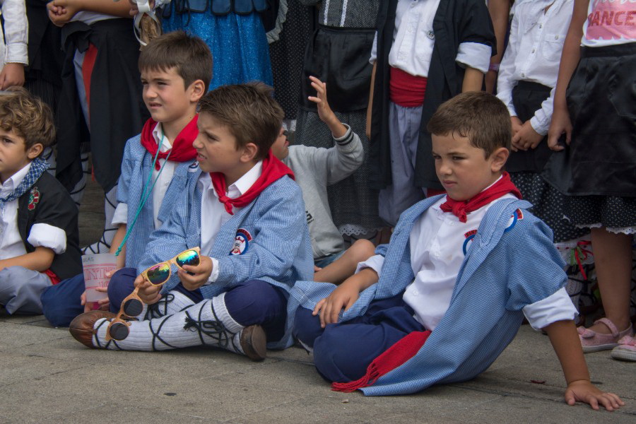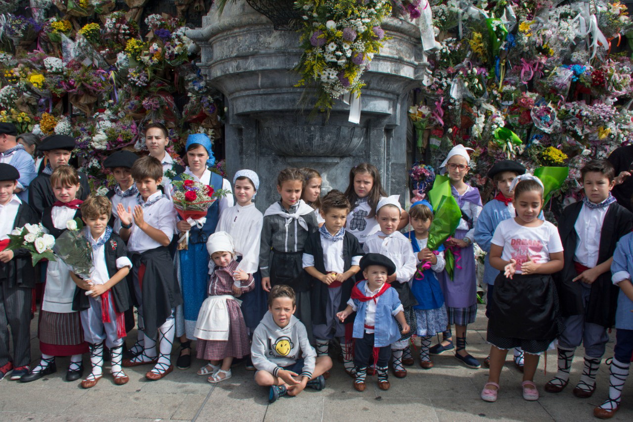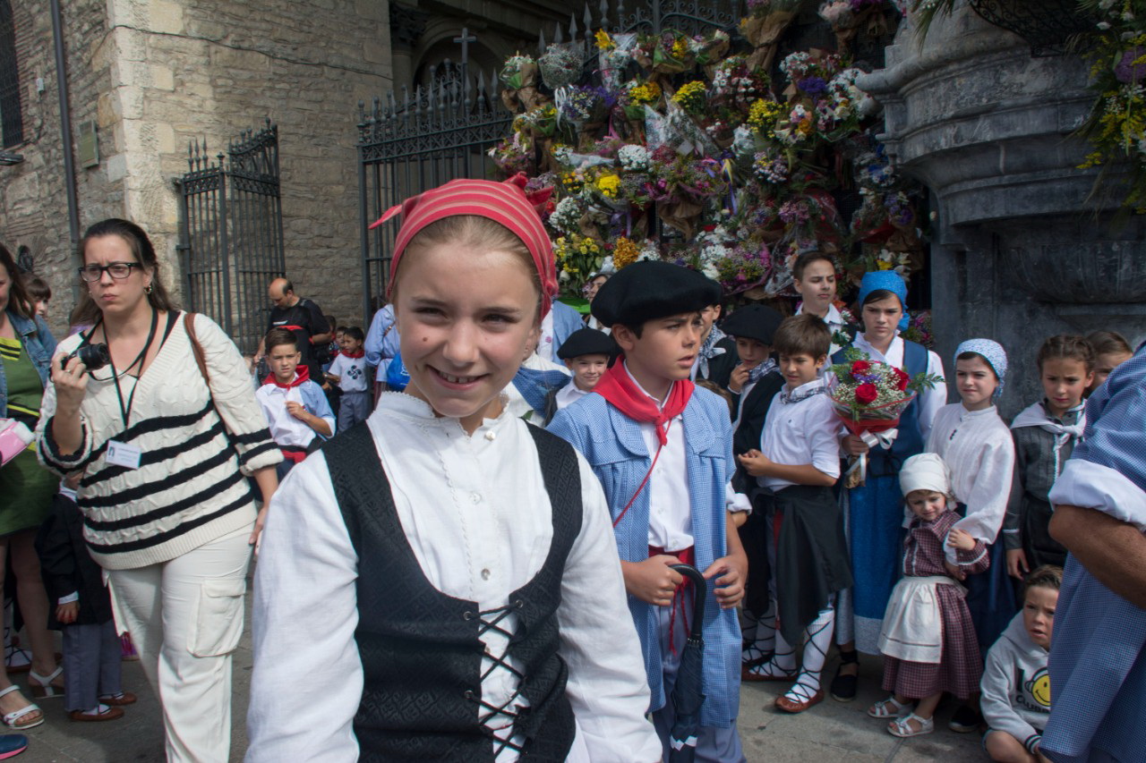 A las 11 h. niños y niñas de todas las edades, primorosamente vestidos y con sus  ramos de flores se han acercado a la balconada y en primer lugar ante la hornacina Edurne y Celedón Txiki  (Paula Rubio y Gonzalo Aranegui) han bailado el aurresku en honor a la Virgen Blanca