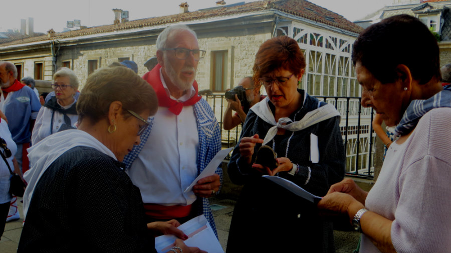 Ante la hornacina ofrenda de flores y el tradicional acto de la imposición de pañuelos rojos a dos veteranos José Luis Gayarre y María Angeles Osés, agradeciendo su entrega a la fiesta. Destacando por edad Celestino González, que a sus 95 años e impecablemente vestido de blusa aguanta el tirón año tras año como un chaval.