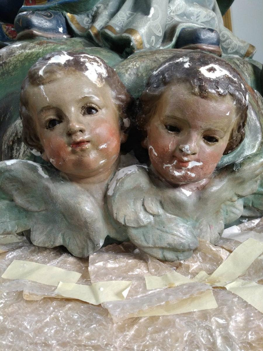 Como ya anunciábamos en el último boletín durante este mes de enero de 2020, se ha procedido a una restauración de urgencia, exclusivamente parcial, de la imagen de la Virgen Blanca Peregrina..