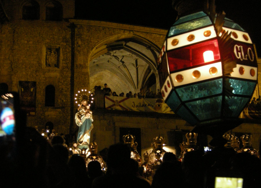 A pesar de las nubes que cubrían el cielo de la ciudad desde media tarde, la procesión de loa Faroles pudo salir sin ningún problema. Miles de personas se iban acercando desde las 21:00 h a la plaza y observaban cómo más de 350 cofrades y devotos de la Virgen Blanca se iban poniendo en disposición de salida. Cada uno de ellos con uno de los elementos procesionales que representan las distintas partes del rezo del Santo Rosario. Así esta centenaria tradición fue una realidad por las calles de Vitoria-Gasteiz. Como día festivo, hemos sido testigos de que ha sido una edición a la que ha acudido mucha más gente de lo habitual. Devoción, silencio y respeto al paso de los elementos procesionales. Abriendo la procesión la Cruz procesional, y como ya va siendo habitual, niños y niñas. portando sus velas. Son ellos el relevo generacional.