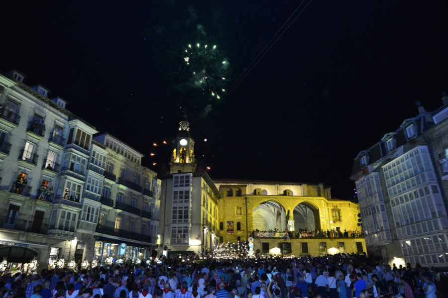 Como colofón la carroza de la imagen de la Virgen Blanca, impulsada por sus porteadores, ha ascendido hasta el pie de la escalinata de la Parroquia de San Miguel, y en este escenario todos los asistentes, ante la imagen y los 60 faroles de Avemarías que forman con sus luces el anagrama del Ave María, han cantado la salve popular, tras la cual la plaza se ha llenado de luces y color de los tradicionales fuegos artificiales. Concluyó así la víspera del día grande de la festividad de Nuestra Señora la Virgen Blanca, patrona de Vitoria-Gasteiz.