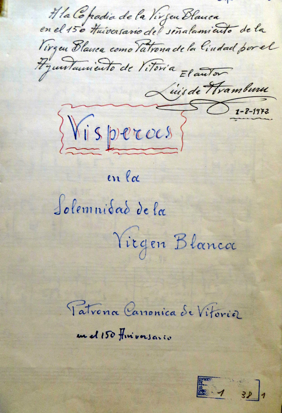 Como otros años pudimos todos participar con los cánticos de la partitura de las Vísperas solemnes que fue compuesta en 1972 por Luis Aramburu coincidiendo con el 150 aniversario (1822) del Patronazgo civil de la Virgen como Patrona de la Ciudad. No obstante la partitura actual cantada por el “Coro de Vísperas” es una adaptación a cuatro voces que se hizo en 1995.