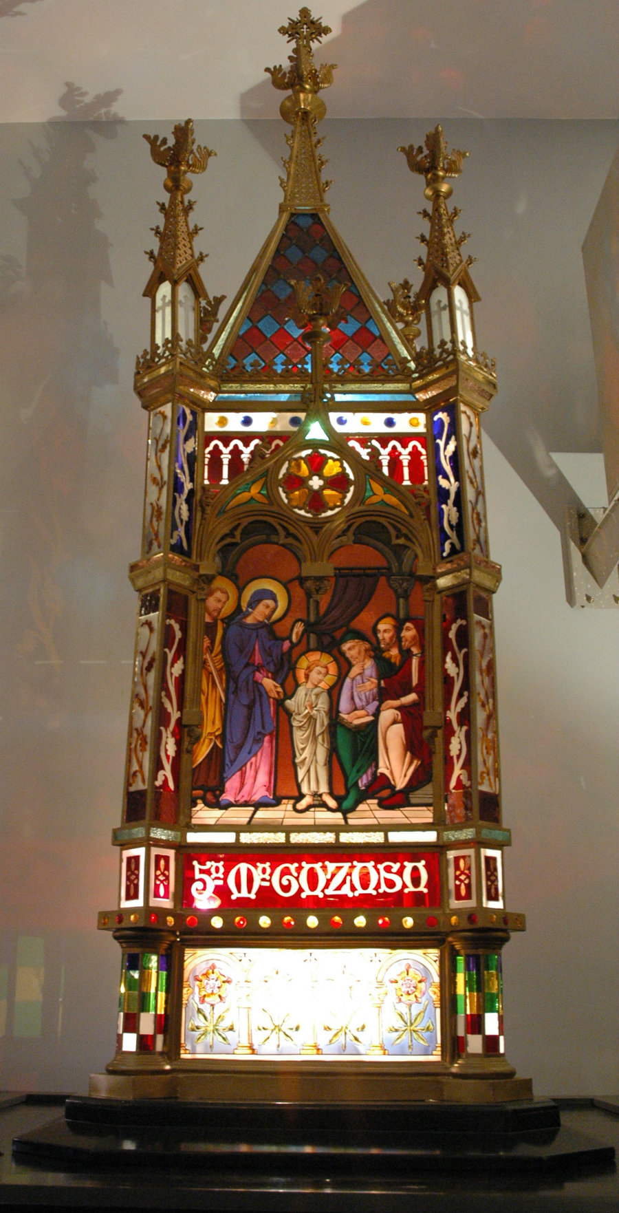La carroza del 5º MISTERIO GOZOSO, se asienta en peana de madera, tienen forma de templete de base cuadrada y su estilo es neogótico. El templete está rematado con chapitel formado con cristales de multitud de colores. En los cuatro ángulos unos pilares con terminación de pináculos. En la base o parte inferior un zócalo de cristal dividido en arquerías con decoración floral y sobre esta base vidrios rojos de forma rectangular figurando en uno de ellos la inscripción del Misterio correspondiente. Destaca el uso de colores primarios, rojo, azul, amarillo, que dan una viveza enorme a cada una de las escenas.