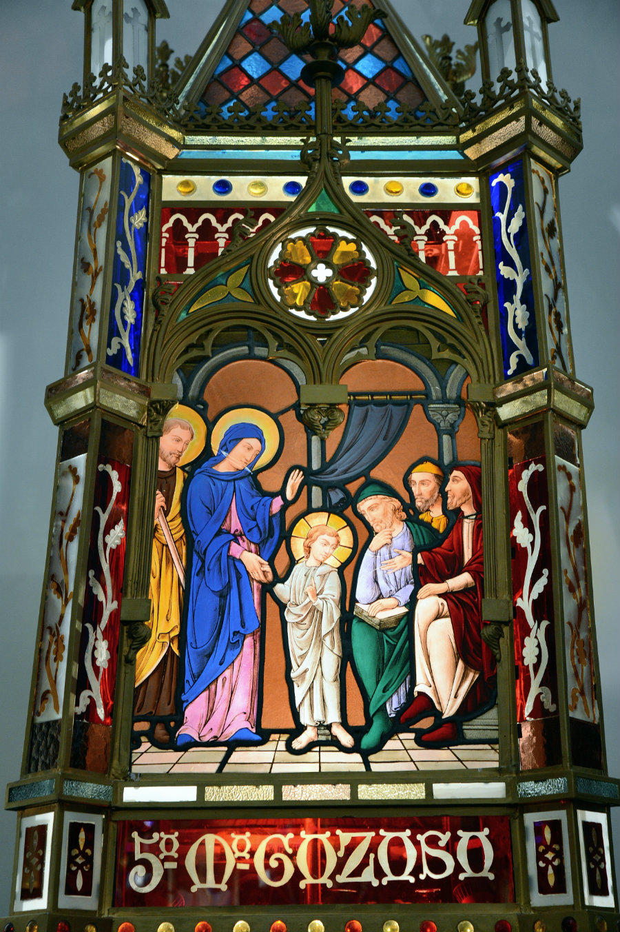 En el cuerpo cuadrado central, en una de sus caras, vemos representado el misterio gozoso “el Niño Jesús perdido y hallado en el templo. siguiendo sus imágenes la iconología tradicional de los personajes de la Vida de Cristo y María. María y