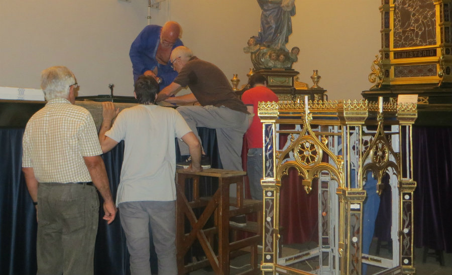 Concluidos los trabajos y ya en el Museo la carroza fue montada, bajo la dirección de Fernández, con la colaboración de los cofrades colaboradores del taller de mantenimiento.
