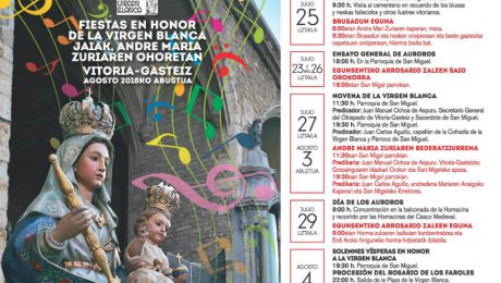 Ya estamos en la cuenta atrás para disfrutar de las fiestas en honor de la Virgen Blanca. Estos días previos son para la Cofradía una vorágine en su actividad diaria, preparación de todos los actos propios como son los actos litúrgicos en honor a la Patrona (Vísperas, Procesión de los Faroles, Rosario de la Aurora,