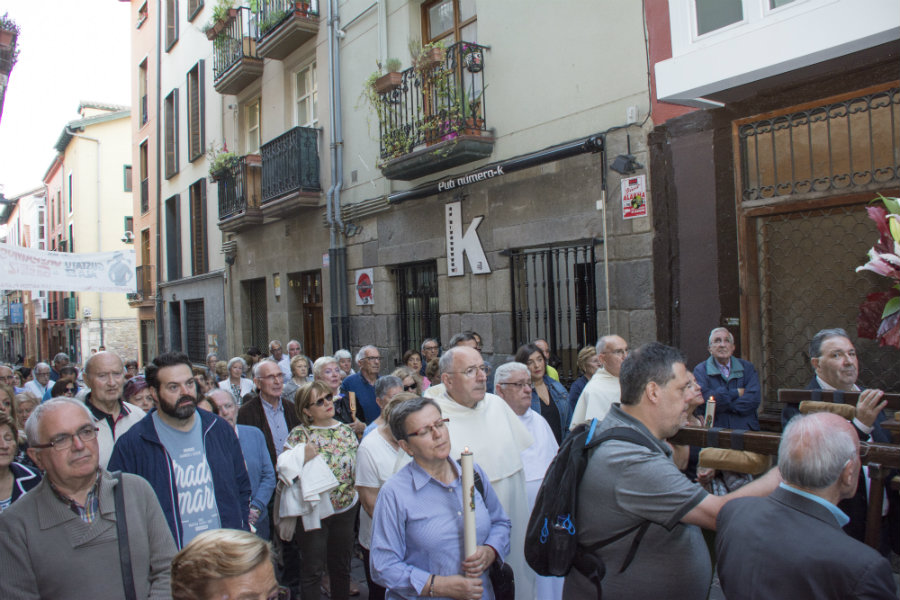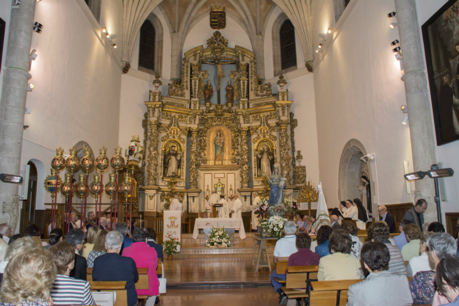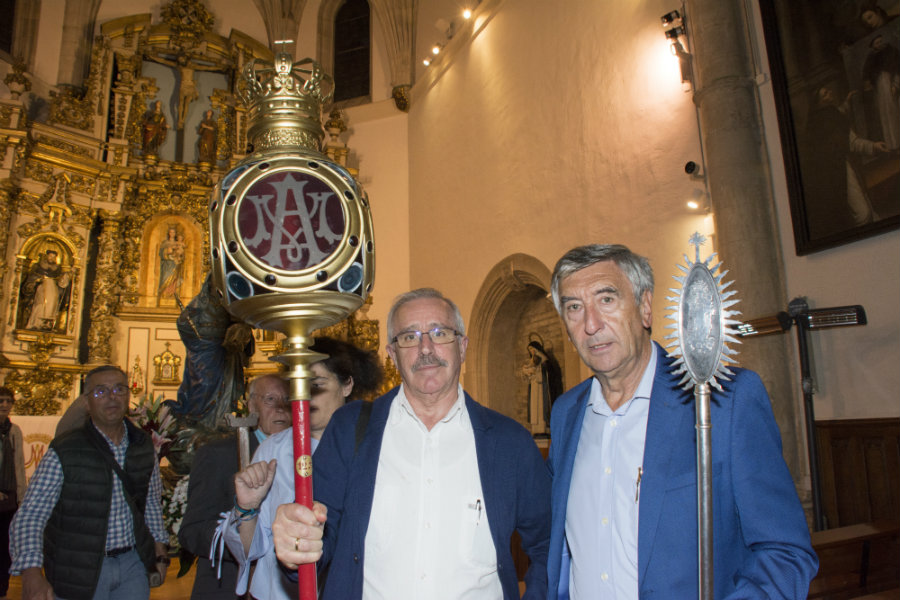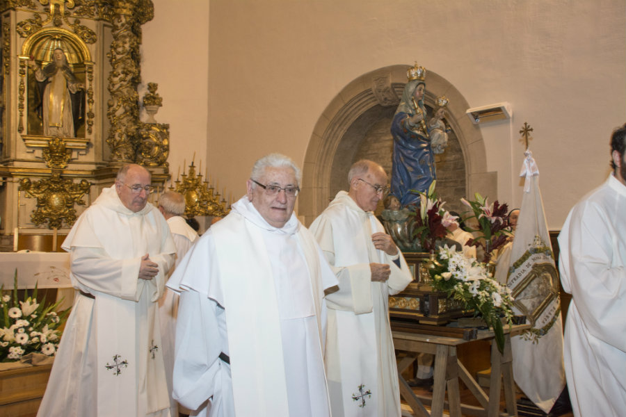 Al ser viernes rezamos los misterios dolorosos, las letanías y diversas canciones marianas. En el Convento de Santa Cruz de las MM Dominicas, nos esperaban el Obispo D. Juan Carlos Elizalde, que presidió la Santa Misa, acompañado de D. Juan Carlos Pinedo sacerdote responsable de la unidad pastoral del casco medieval, el diácono Fidel Molina de la parroquia de Santa María, responsable de Berakah, y Antonio José, seminarista, que junto al grupo de amigos de la fraternidad Dominica, hicieron que nos encontráramos como en nuestra propia casa. Presidía el altar la imagen de la Virgen Blanca , y la imagen titular de las Dominicas, la Virgen del Rosario. La iglesia estaba llena de participantes, que al finalizar la eucaristía , fueron invitados a un chocolate con los dulces preparados por las dominicas, las cuales no dejaban de pedir que la Virgen Blanca, se quedara todo el mes con ellas, asegurándole el Abad, que D.M. el próximo año volveremos, pues queremos que este rosario quede como uno de los hitos permanentes de la actividad de la Cofradía de la Virgen Blanca, por muchos años.