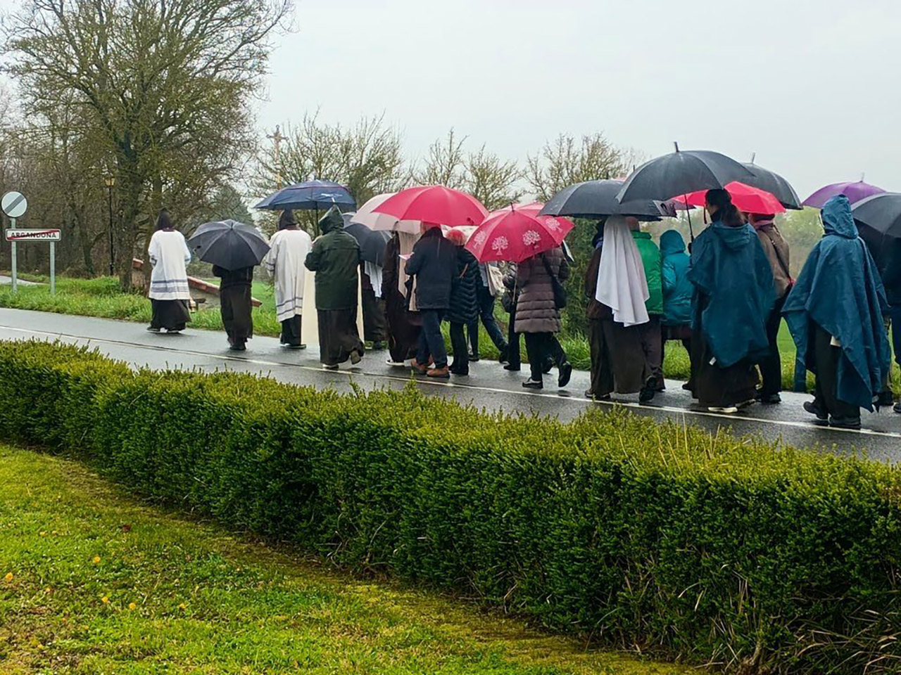 La mañana fría y lluviosa, no impidió la celebración de este paseo rezado, desde Argandoña al Santuario de Estíbaliz. De la mano de las Hermanas Peregrinas de la Eucaristía, donde la Cofradía de la Virgen Blanca, se hizo presente.